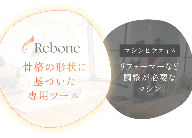 一般的なマシンピラティスは複雑な調整が必要で、操作に不安を感じたり、負荷が合わずに身体に負担をかけてしまう場合も。Reboneで使用するのは、骨格の形状に基づいて作られた専用ツール。