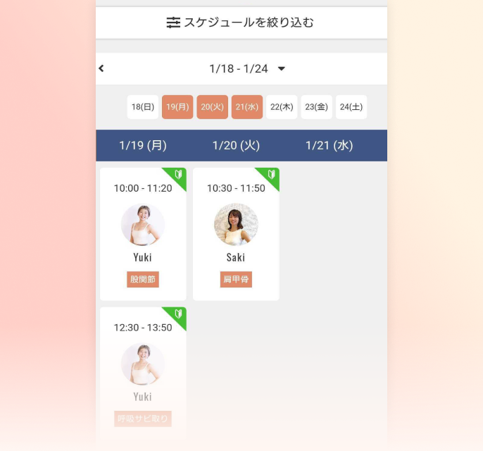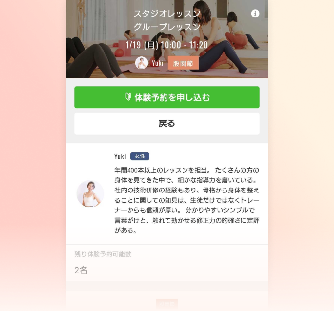 体験可能なレッスンのみが表示されているので、ご自身のお悩みやスケジュールに合わせて、お好きな日時をお選びください。