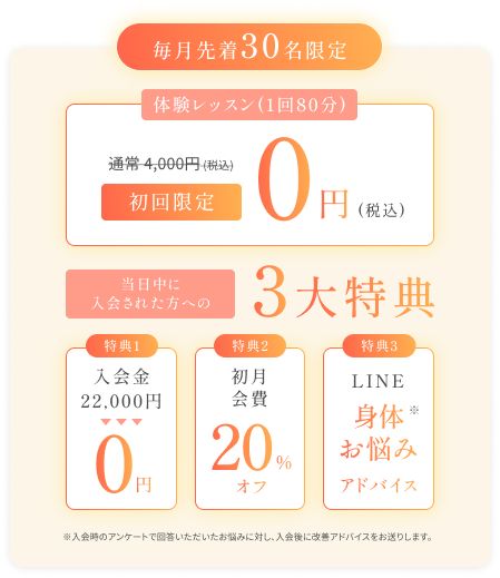 レッスンの参考のため、来店のきっかけや運動歴など、アンケートへご回答ください。